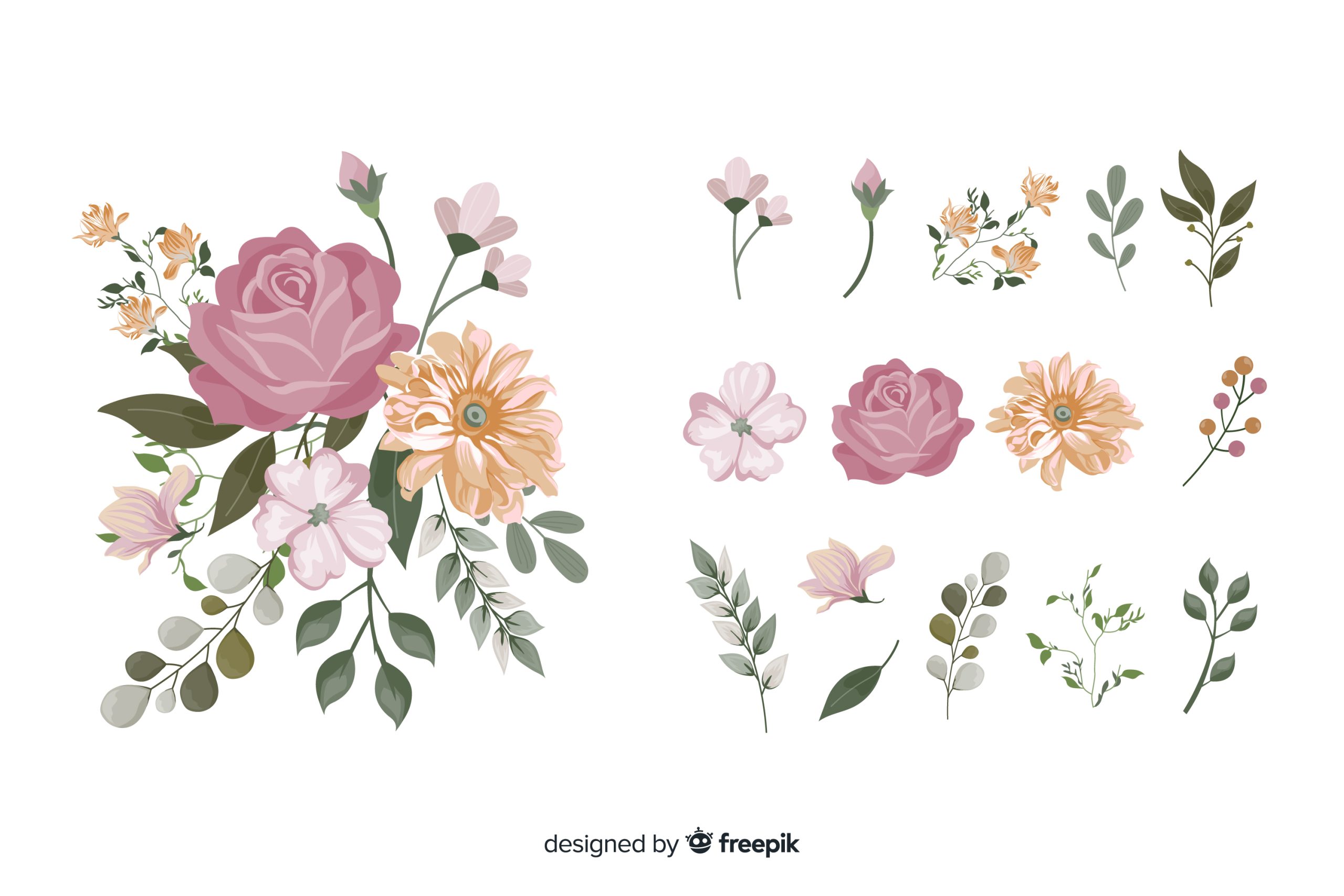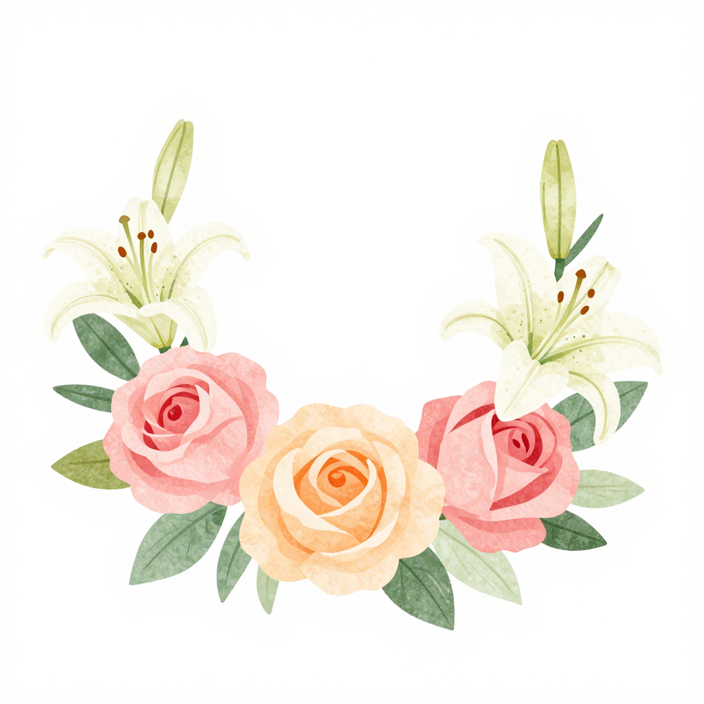 Elegant vector illustration of luxury event floral decoration, featuring soft pastel flowers, roses and lilies, arranged in a modern event setting, clean flat design, smooth gradients, minimal background, floral elements only, no people, premium aesthetic, high resolution vector style